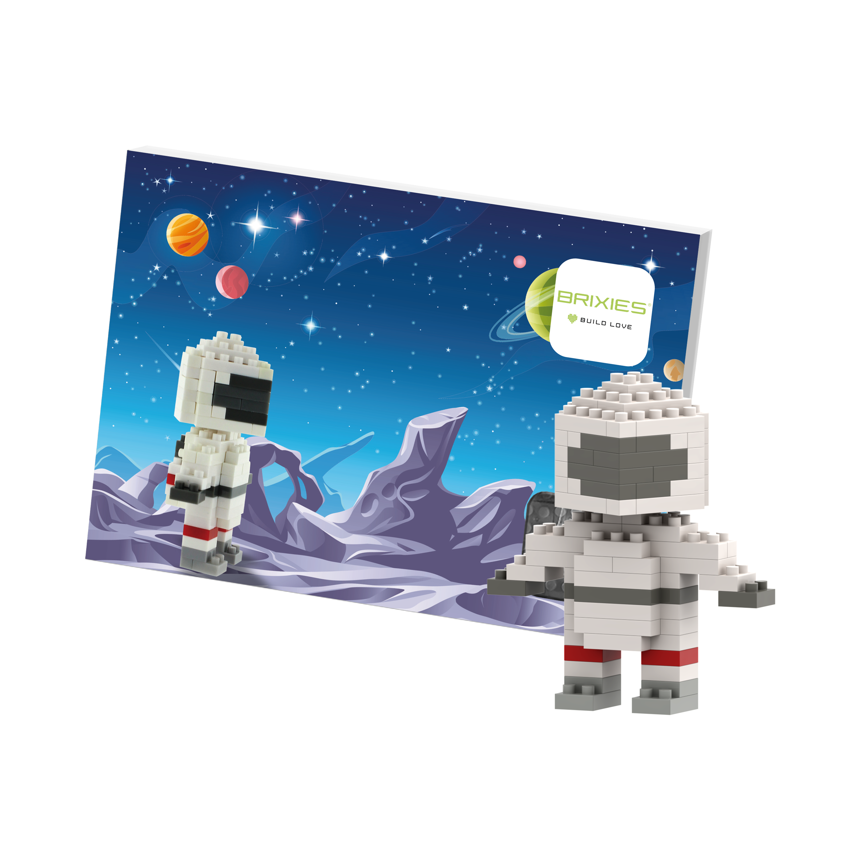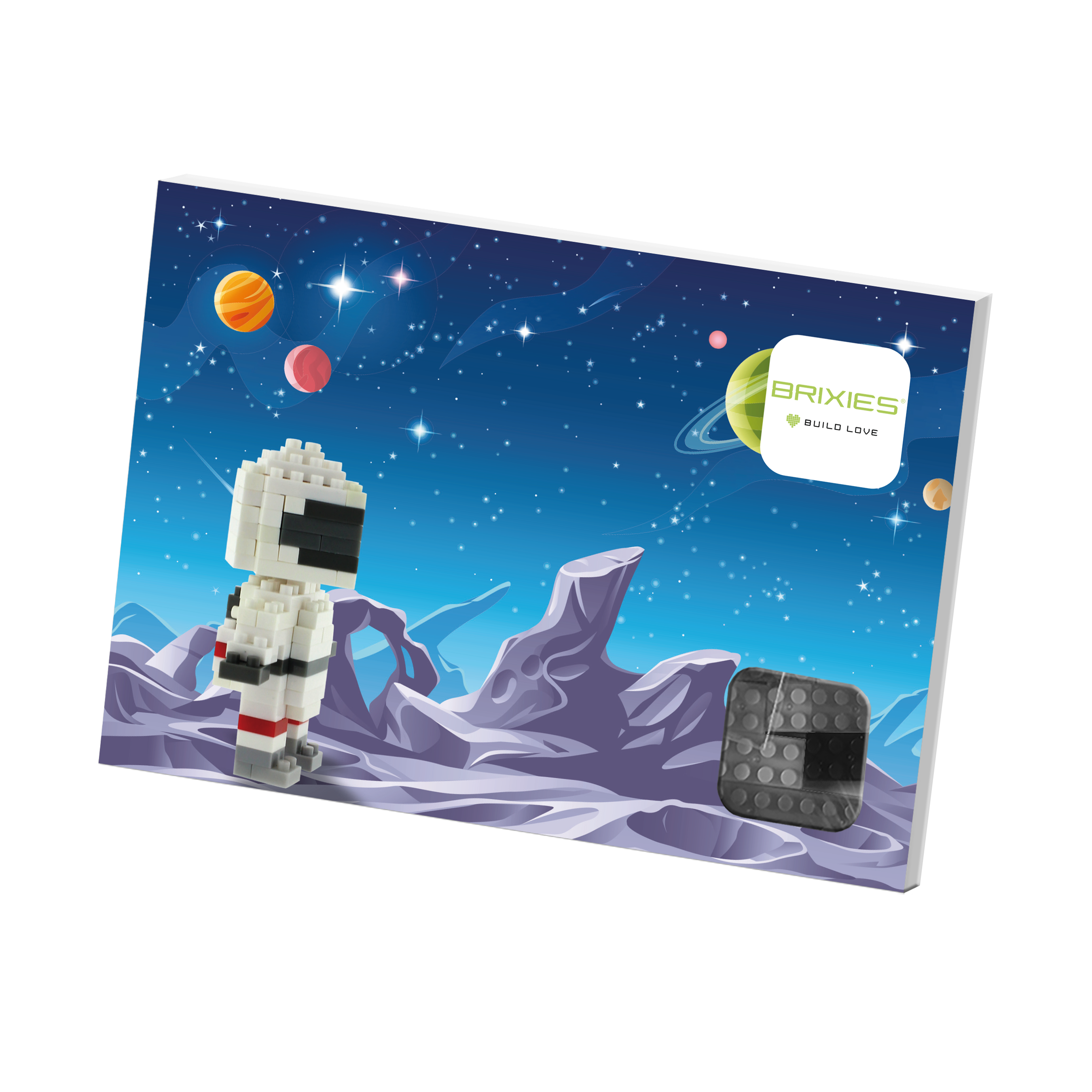 Send memorable little greetings! BRIXIES postcards, complete with a building kit, bring joy as you unpack, assemble, and collect them. Take a journey into space with our "Astronaut" postcard and experience an adventure in zero gravity.